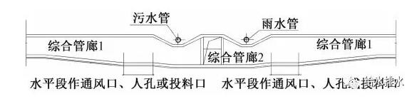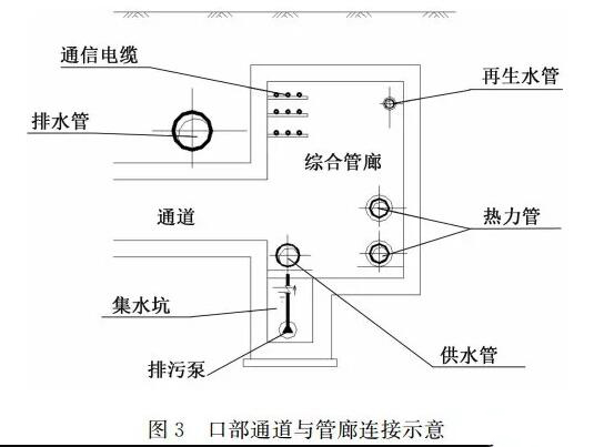 ?。?)通風口、人孔及投料口等口部與管廊之間的通道和其他管線交叉時,綜合管廊向下折翻,既要確保通道凈高(不小于1.5m)的前提下保證通道頂在排水管以下(每一處都要結合排水管網施工圖詳細計算),又要避開通道在管廊開口處的管線遮擋以免局部管廊埋深和凈高加大。為減小管廊局部下臥深度,以便減小施工難度、降低建設投資,各口部及通道均設在給水及電信線纜一側??诓客ǖ琅c管廊連接示意見圖3。