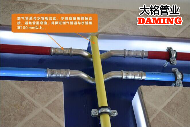 驗收技巧:燃氣管道與水管相交處,水管應(yīng)使用管橋連接,避免管道彎曲,并保證燃氣管道與水管距離100mm以上。